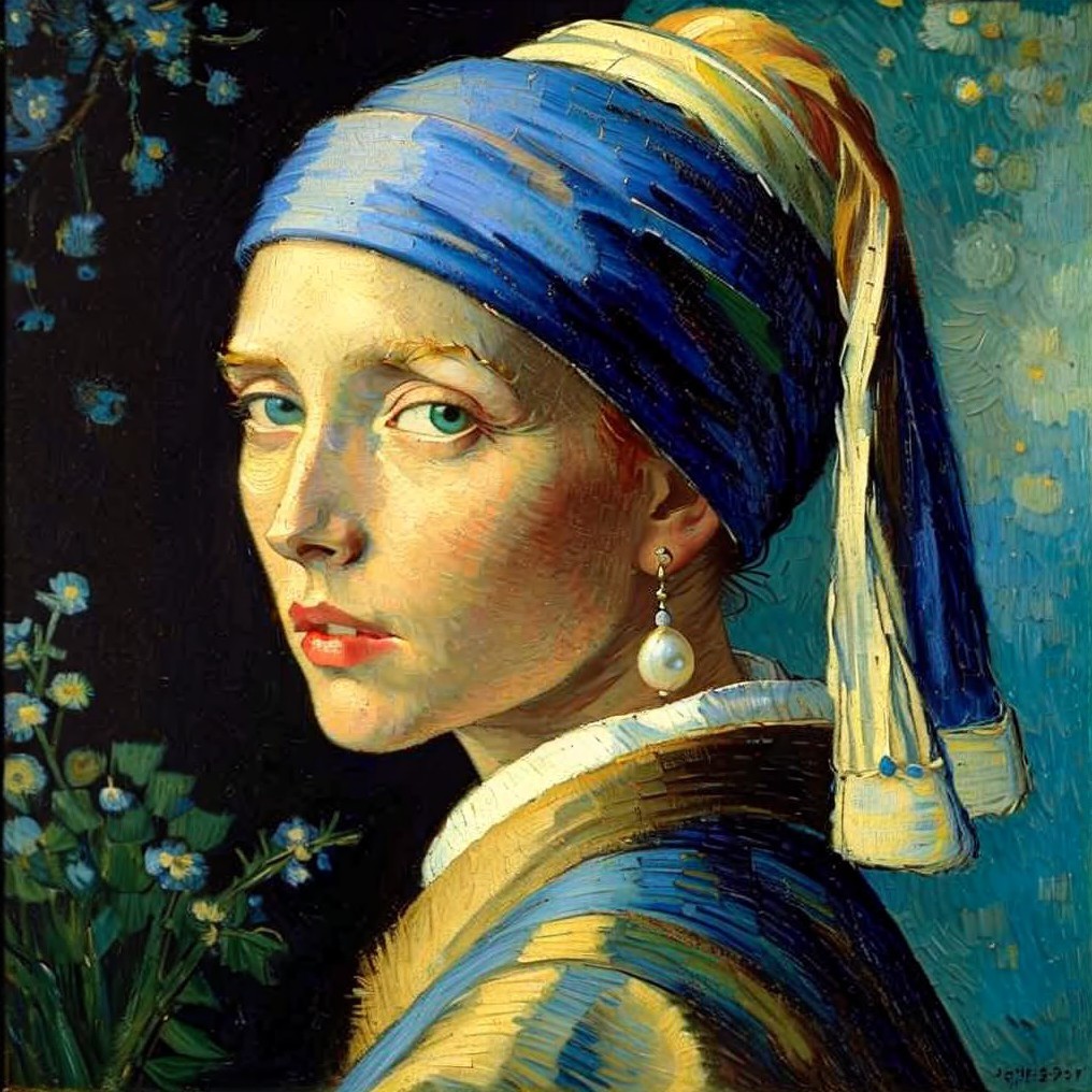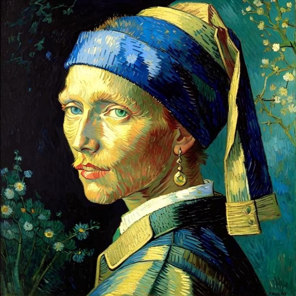 Woman Portrait with Blue and Yellow Headscarf and Pearl Earring