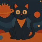 A whimsical paper art scene features a black cat with bright yellow eyes, sitting in front of a stylized orange planet. The background includes stars and layered abstract shapes, creating a playful cosmic vibe.