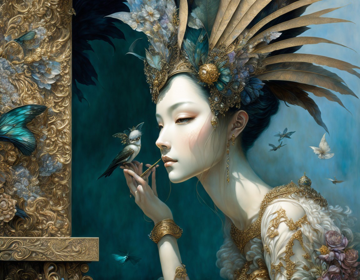 A woman wearing a decorative headdress holds a bird on her finger, with an intricate backdrop and soft, ethereal lighting.