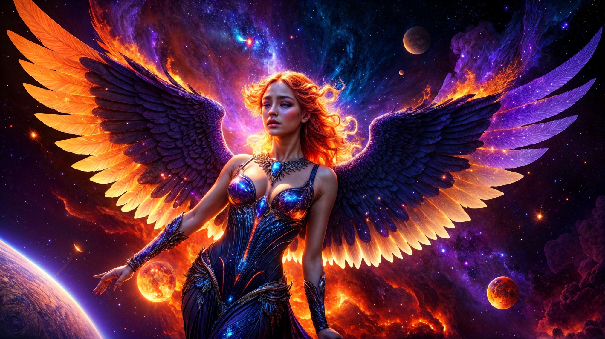 A celestial figure with large, vibrant wings stands against a cosmic backdrop. Her royal attire shimmers, exuding power and elegance, while galaxies and planets swirl in the colorful space behind her.