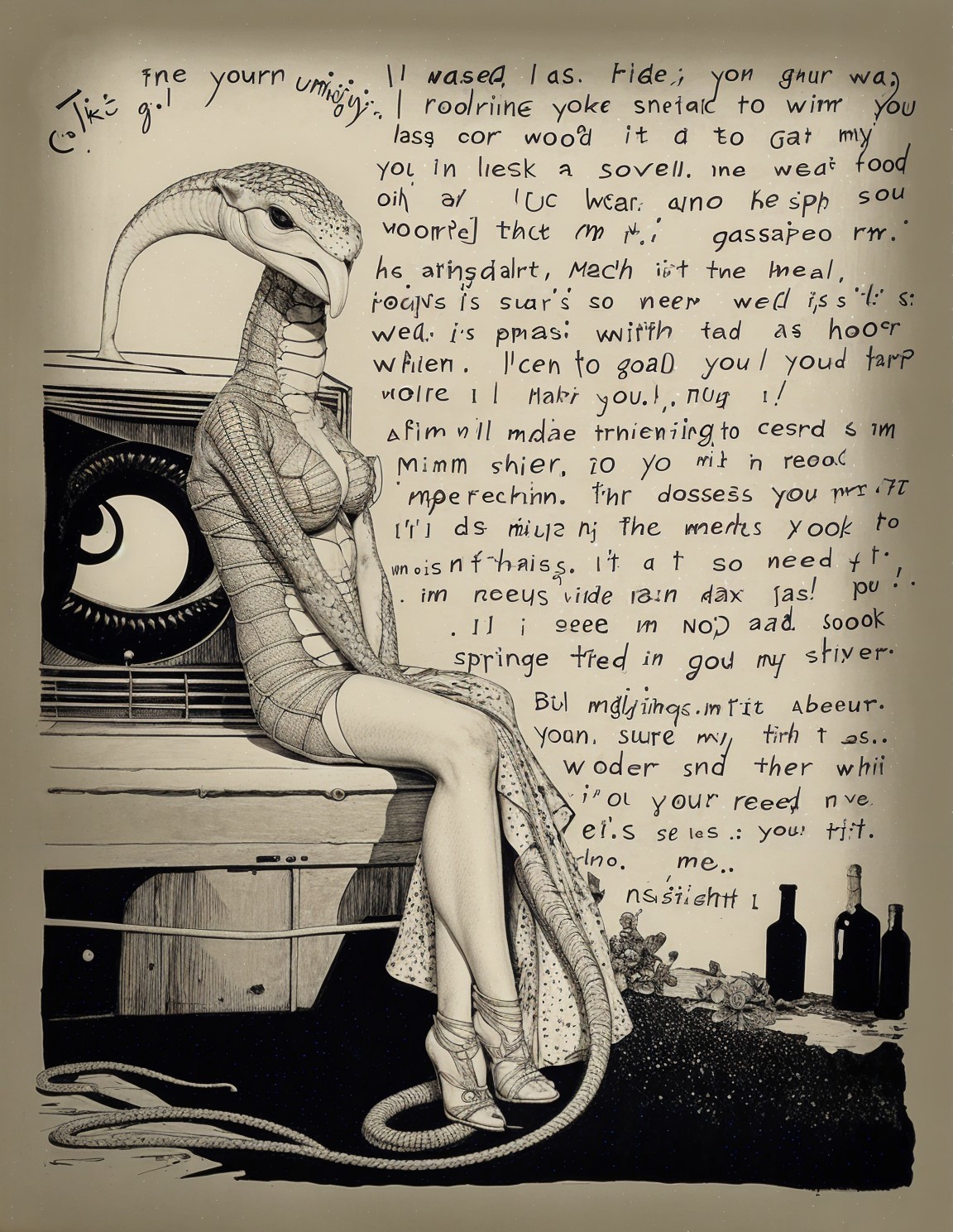 Prompt: Create an image of a humanoid figure with an elongated, bird-like head resembling a lizard or a dinosaur, featuring a smooth, textured skin tone akin to that of a reptile. The character is seated on a low surface, wearing a form-fitting, stylish outfit that emphasizes an hourglass figure. The outfit is detailed with a polka-dot pattern and includes a delicate shawl draped over one shoulder. The character has long, slender legs adorned with high-heeled shoes that enhance their elegant posture. The scene is set in a dimly lit environment with dark, moody elements like vintage furniture in the background, and bottles on a nearby surface, hinting at a mysterious ambiance. The overall composition should evoke a blend of surrealism and elegance, capturing the character's unique features and the intricate surroundings.