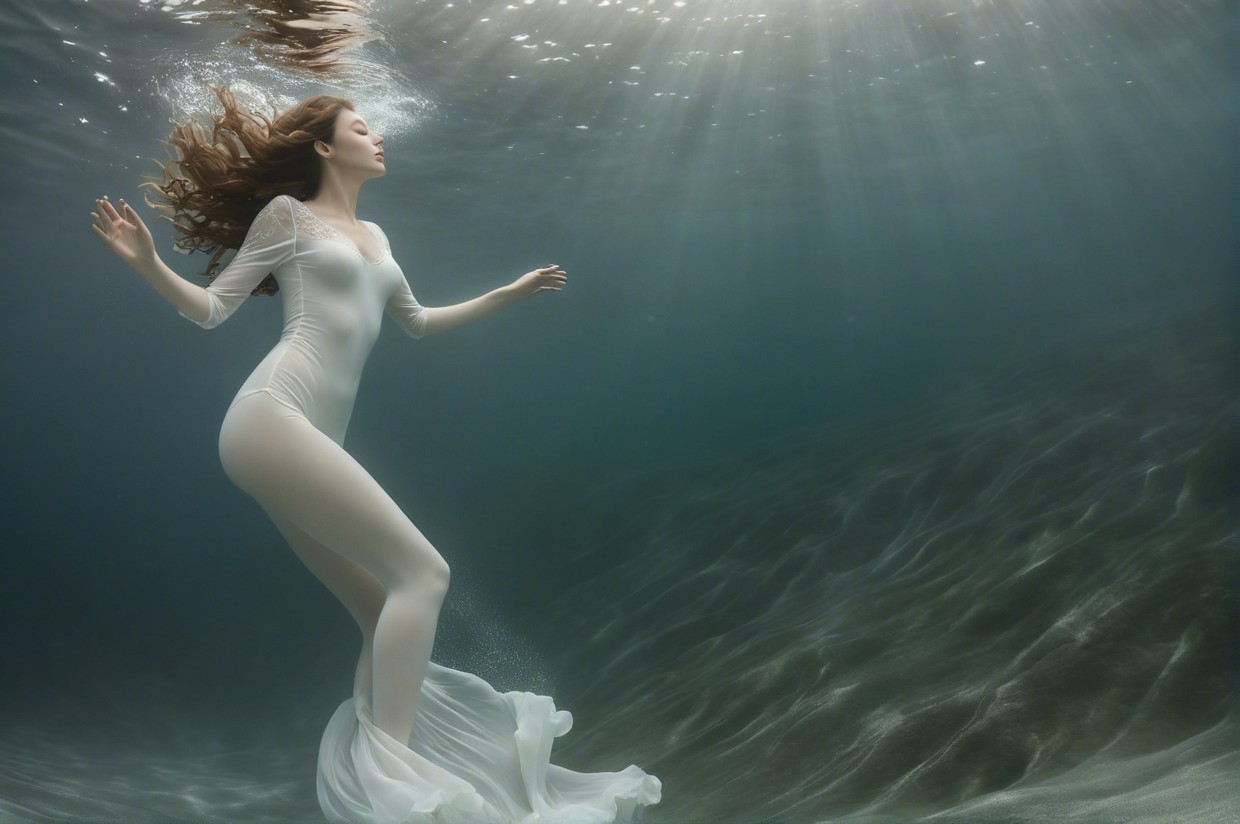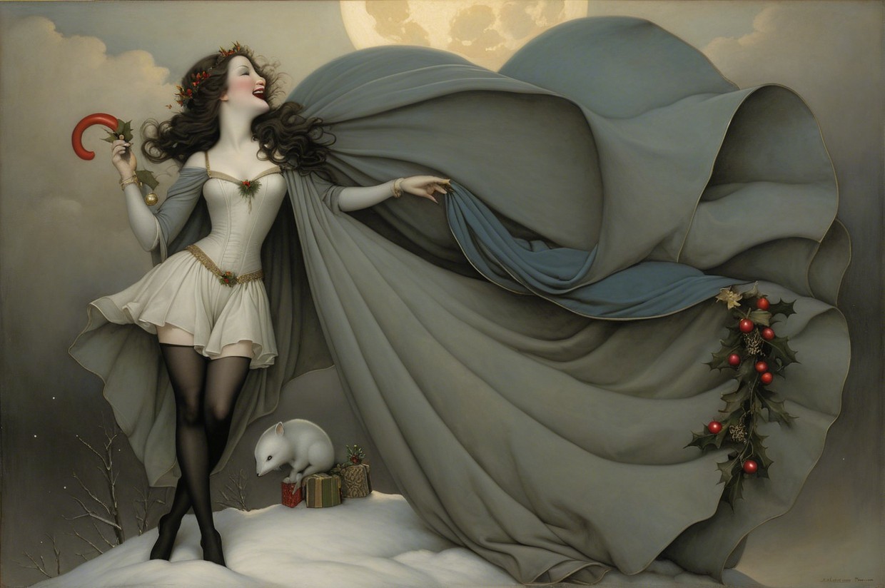The artwork features two ethereal figures in a mystical setting. One, adorned with poinsettia leaves, embodies vibrant nature, while the other, draped in dark robes, exudes serene tranquility.