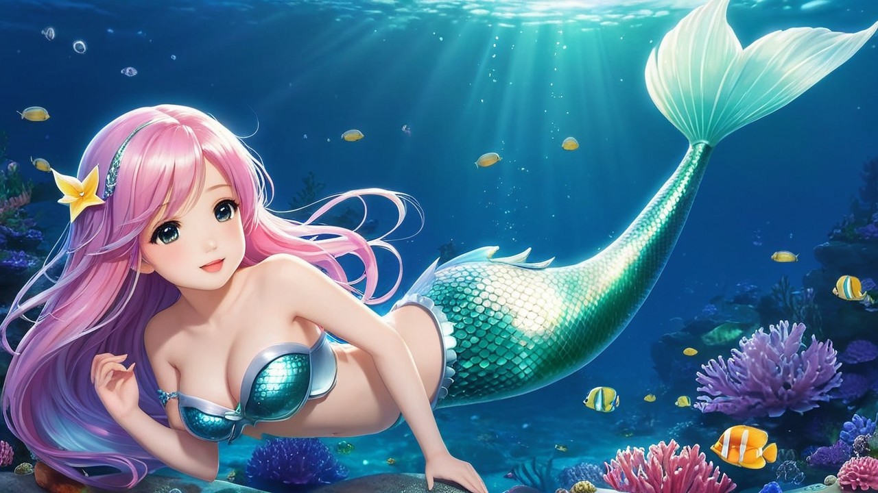 A charming anime mermaid character radiates cuteness while showcasing her protective nature. With vibrant colors and whimsical features, she embodies strength and grace, ready to safeguard her friends in enchanting underwater adventures.
