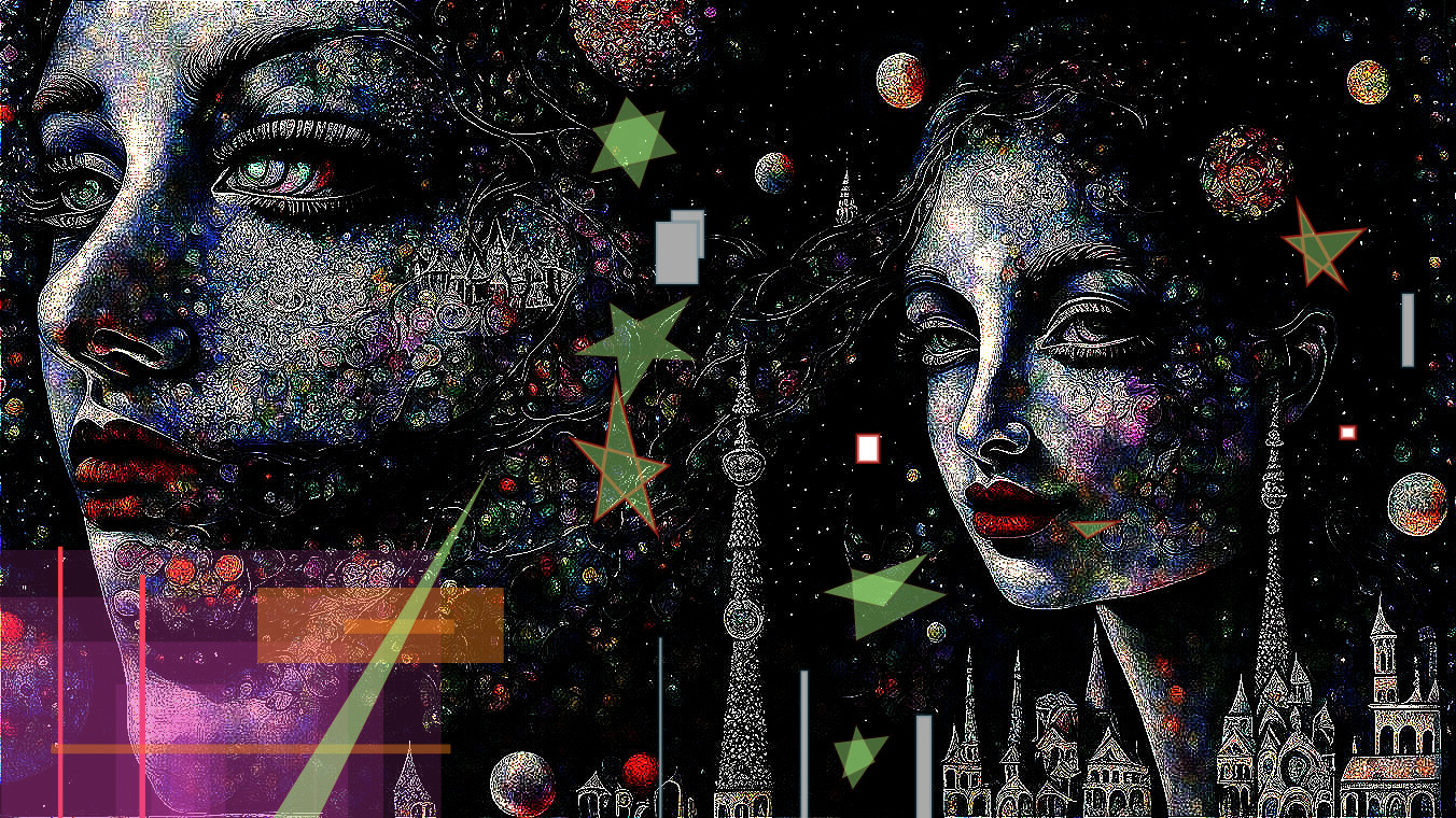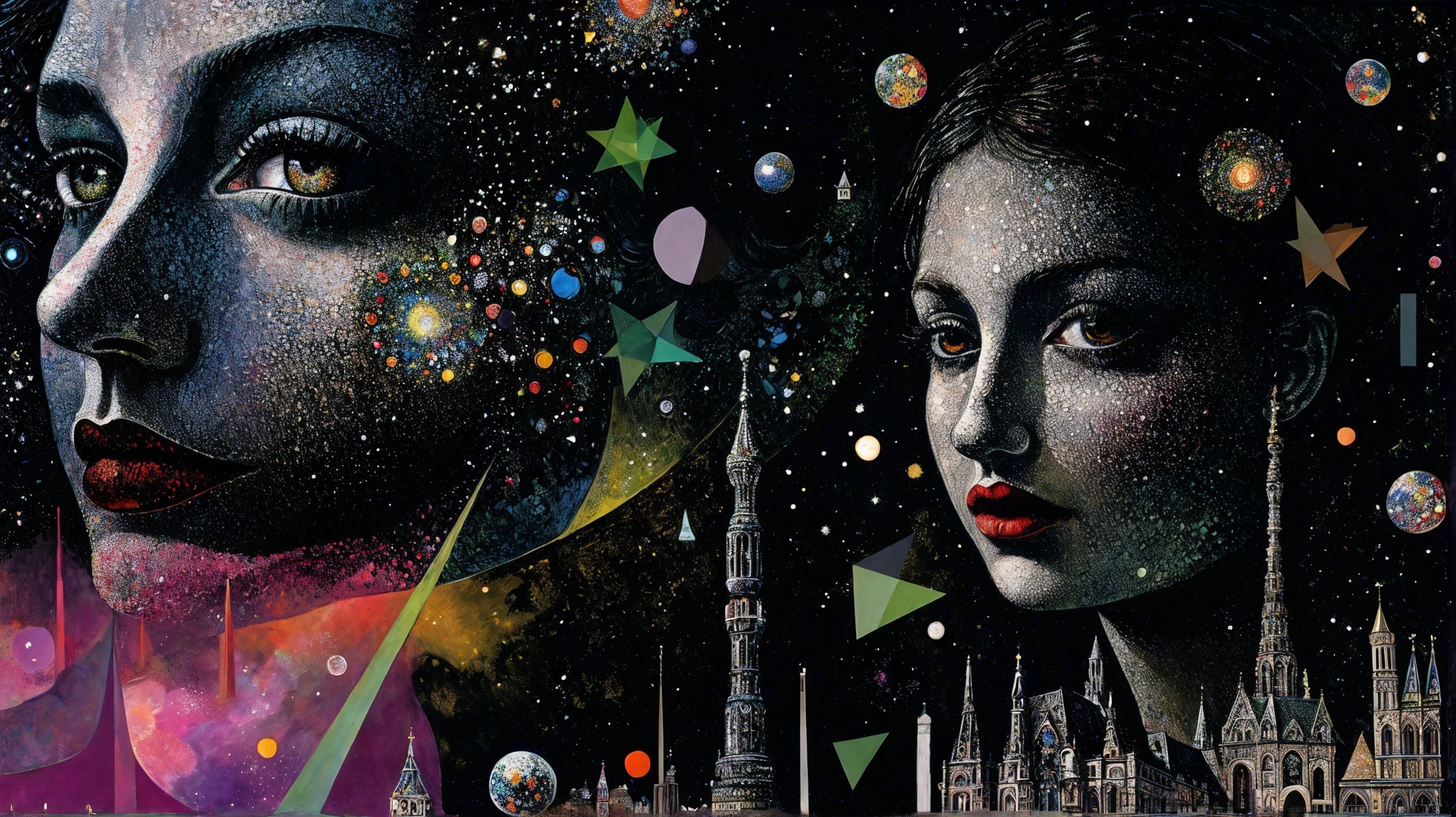The artwork features two striking faces against a cosmic background of stars and planets, complemented by geometric shapes and a silhouette of ornate architecture. A blend of surrealism and beauty.