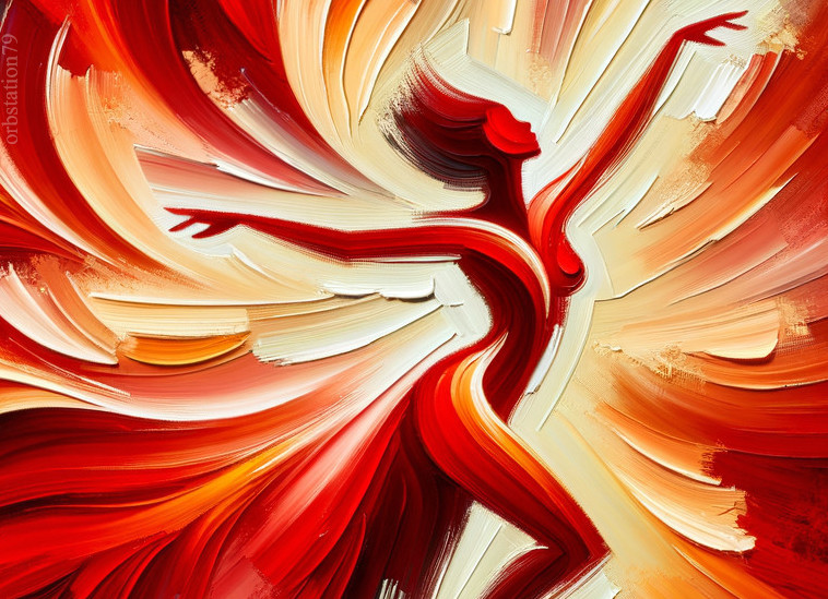 A captivating oil painting features a deep-red silhouette of a female figure in a sensual dance, characterized by bold brushstrokes that evoke allure and emotion, celebrating the beauty of movement.