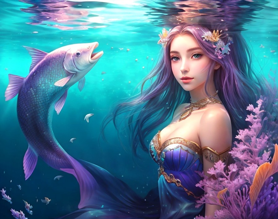A girl living underwater anime style. Lots of fish are following her. She is not a mermaid, she just lives underwater and swims very well and elegantly. Anime style. She is wearing a long dress with ling sleeves.