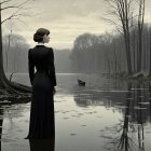 A woman in a sleek black dress stands in a minimalist, monochromatic bar, while a bartender watches from behind the counter. The scene evokes a moody, retro atmosphere.