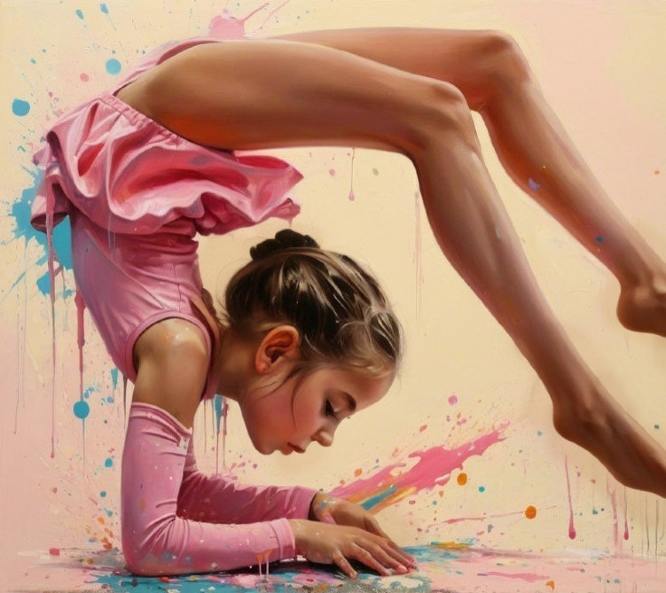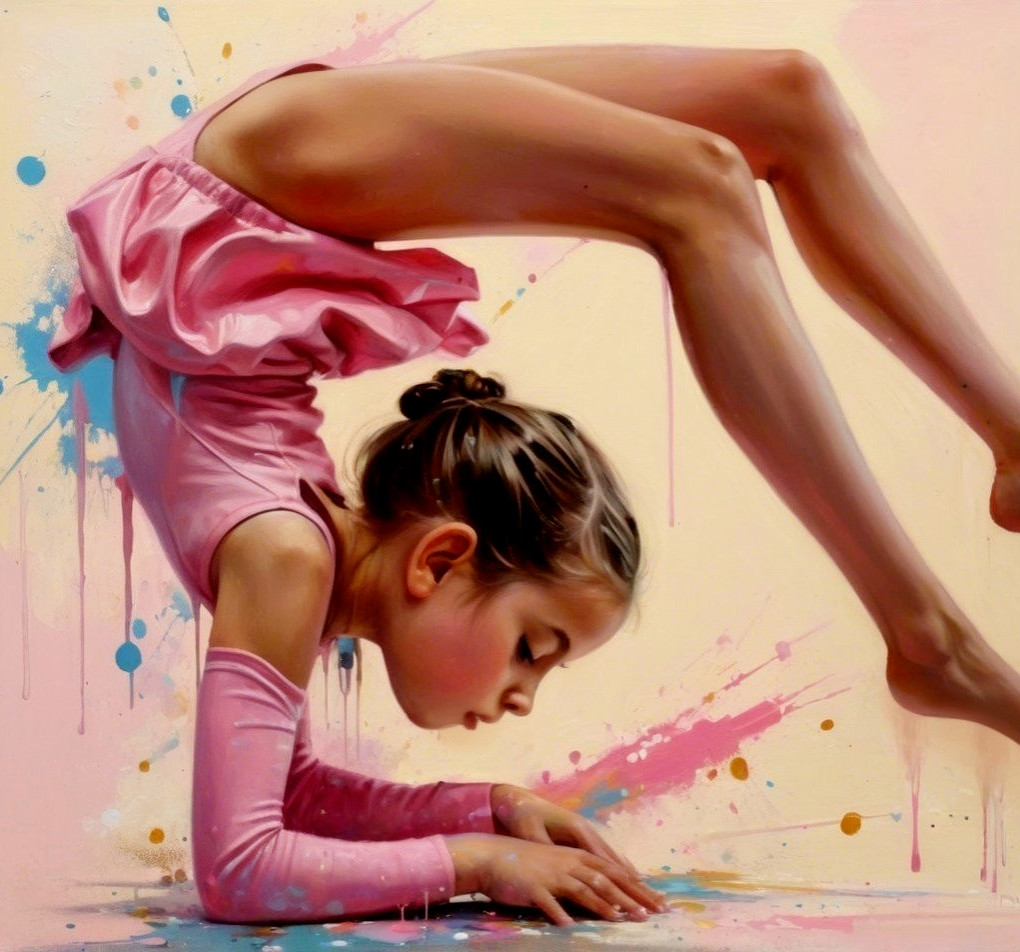 Prompt: Young gymnast in pink; speedpaint with large brush strokes paint splatter; paint drips; drip painting; a masterpiece; maximalist; uncanny; highly detailed and intricate, metallic bright colours
