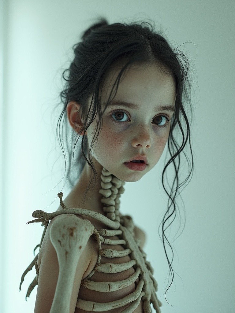 Prompt: 151515; [photo of young girl,skinny anatomy,gnarled bony clothes,standing in retro white space,hauntingly beautiful,,captured with 85mm lens,high resolution,soft focus,cinematic lighting;evoking dark fantasy atmosphere,8k,highly detailed,by Joel-Peter Witkin]