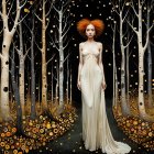 A captivating figure with an ornate golden dress and striking red curls stands in a magical forest. Surrounding her are golden orbs and soft tree silhouettes, creating an enchanting atmosphere.