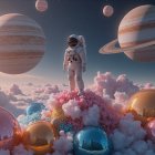 A colorful, surreal scene features an astronaut standing on a vibrant, cloudlike landscape, gazing at majestic planets and swirling colors, evoking a sense of wonder and exploration.
