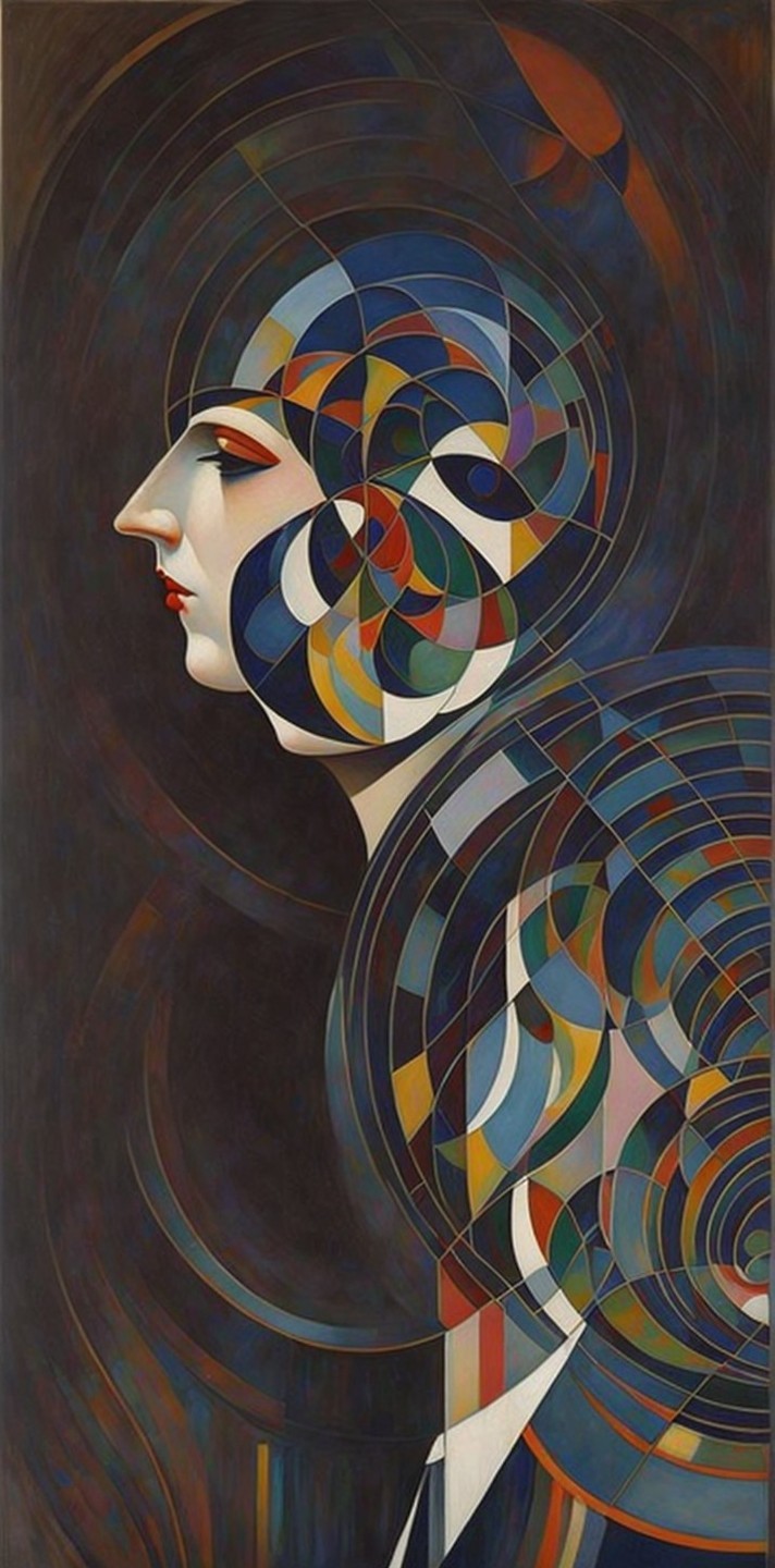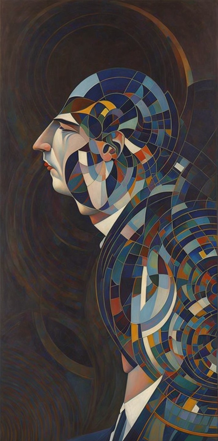A stylized portrait of a person with colorful, swirling, geometric patterns superimposed on their profile, against a dark background with similar motifs.