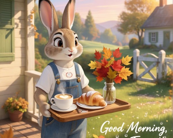 A charming rabbit in red-striped overalls serves coffee and a croissant on a tray in a cozy kitchen, adorned with fresh flowers and a welcoming atmosphere.