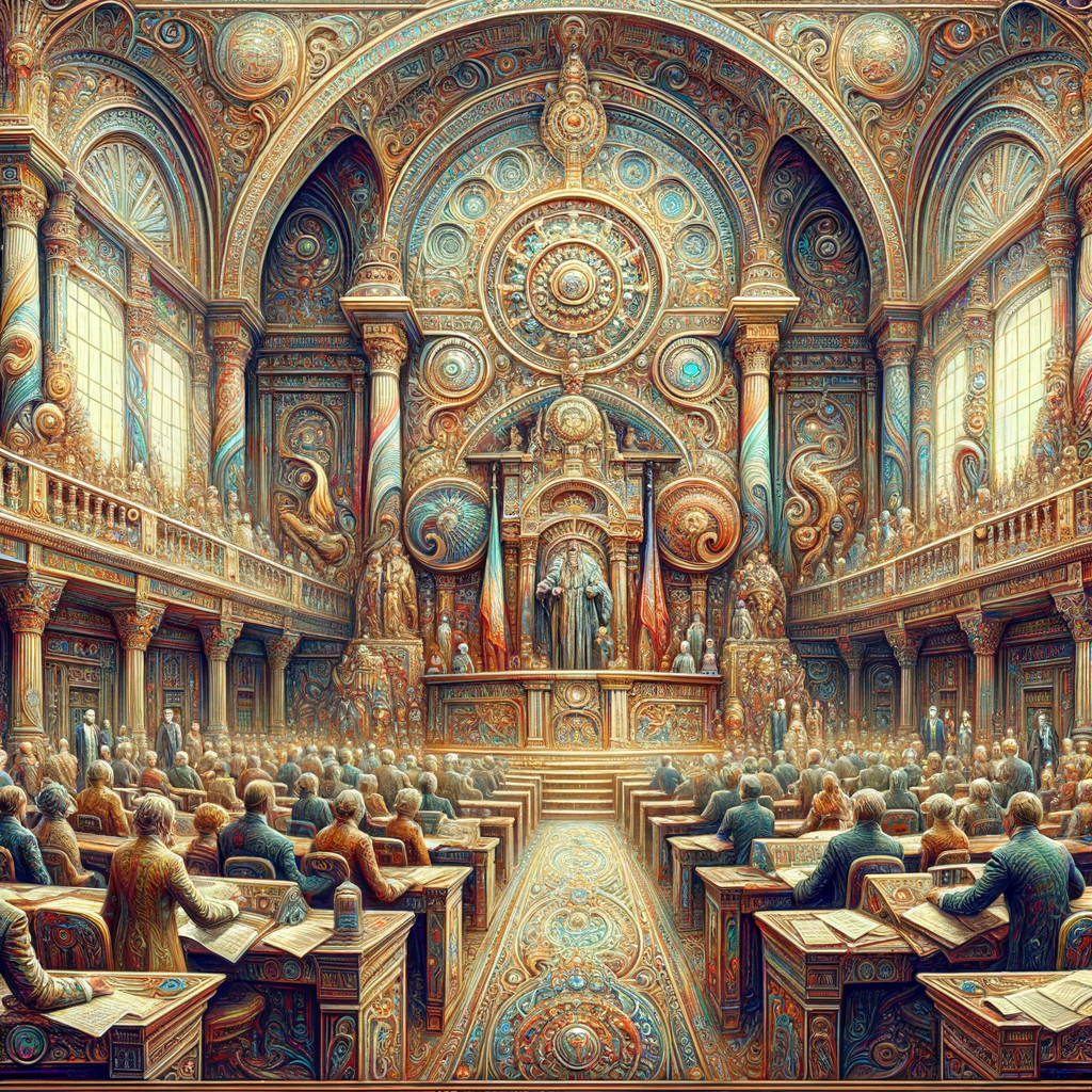 A lavish coronation ceremony in a grand hall with intricate arches, a large crowd, and a central monarch figure under a hovering crown.