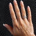 A close-up studio shot shows a Caucasian woman's upturned right hand, adorned with a silver ring featuring a clear teardrop-shaped gem, and speckled with many small clear droplets of water. The hand is angled with the fingers pointing upward and slightly to the left, while the thumb points