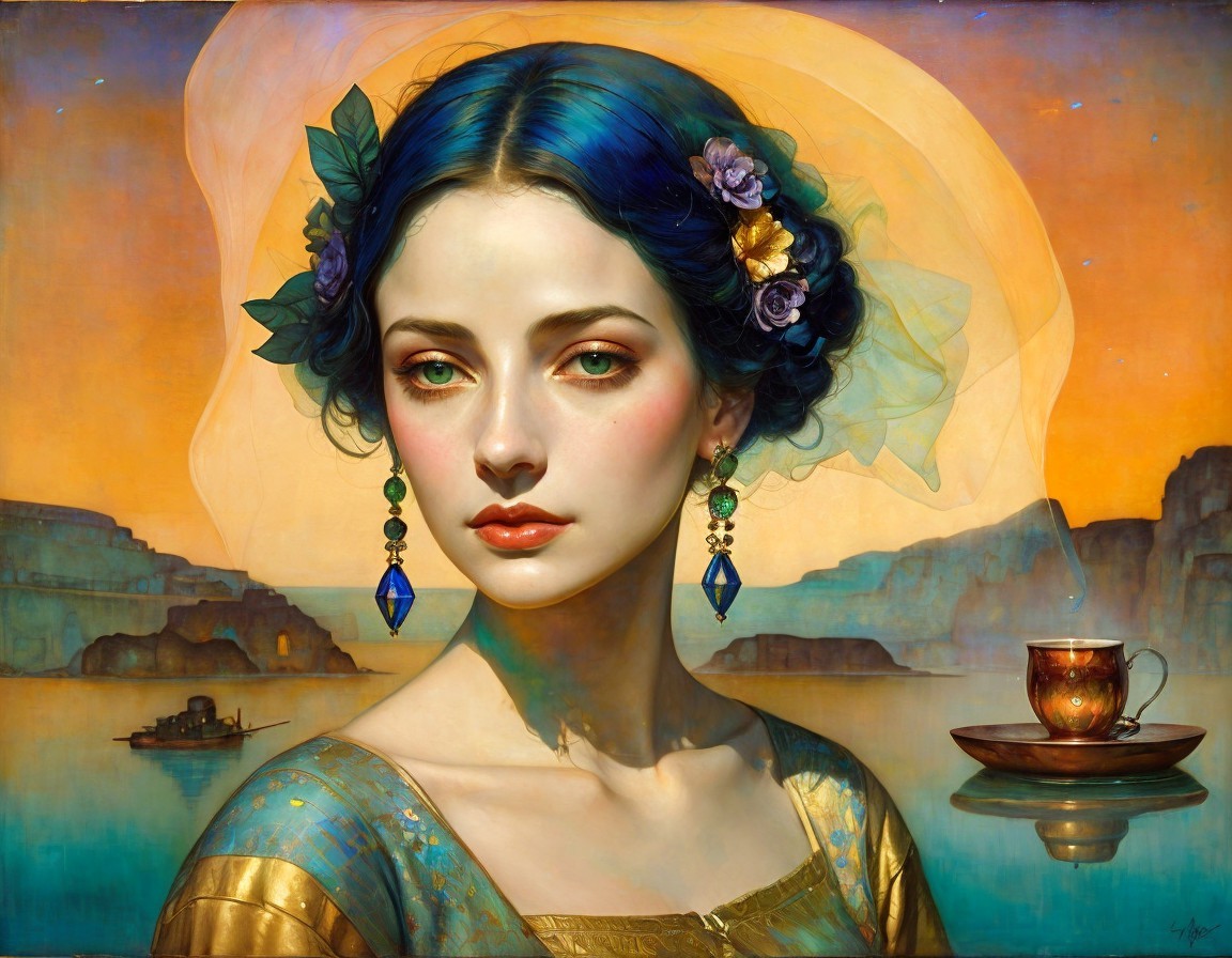 A serene woman with striking blue hair adorned with flowers gazes out, framed by a golden halo. She wears elegant jewelry and rich clothing, set against a tranquil landscape.