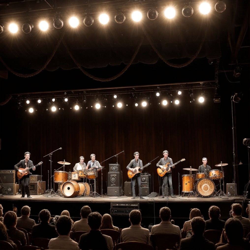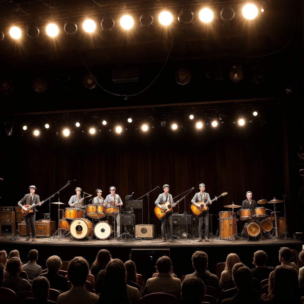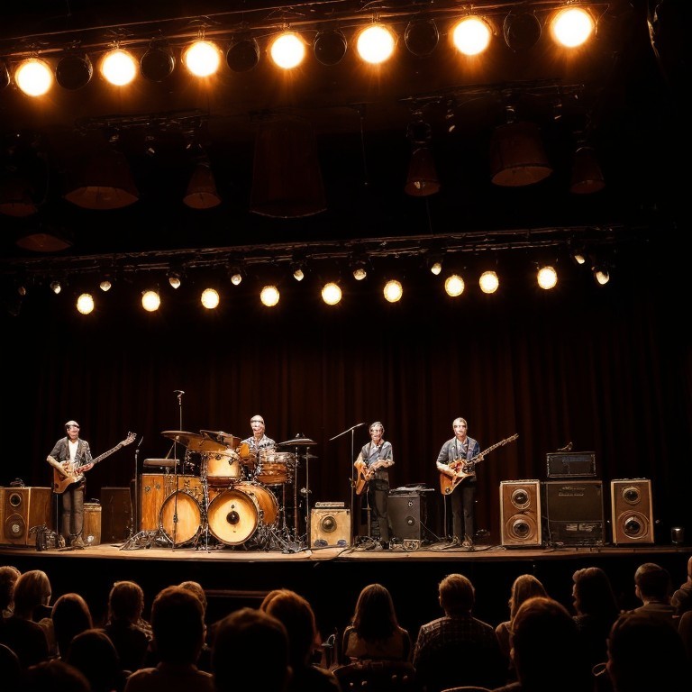 A jazz band performs live on stage for an attentive audience in a cozy venue with warm lighting.