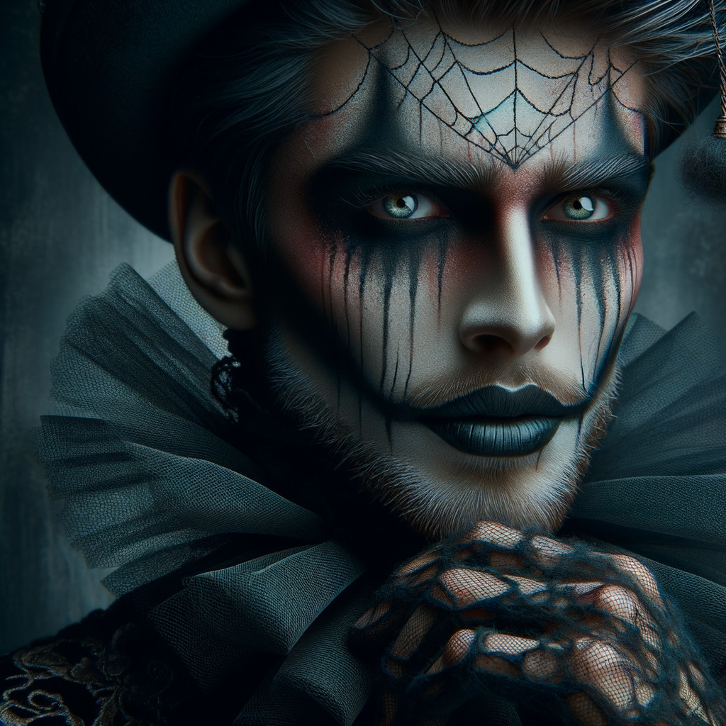 Dramatic spider web makeup with red accents, hat, and ruffled collar