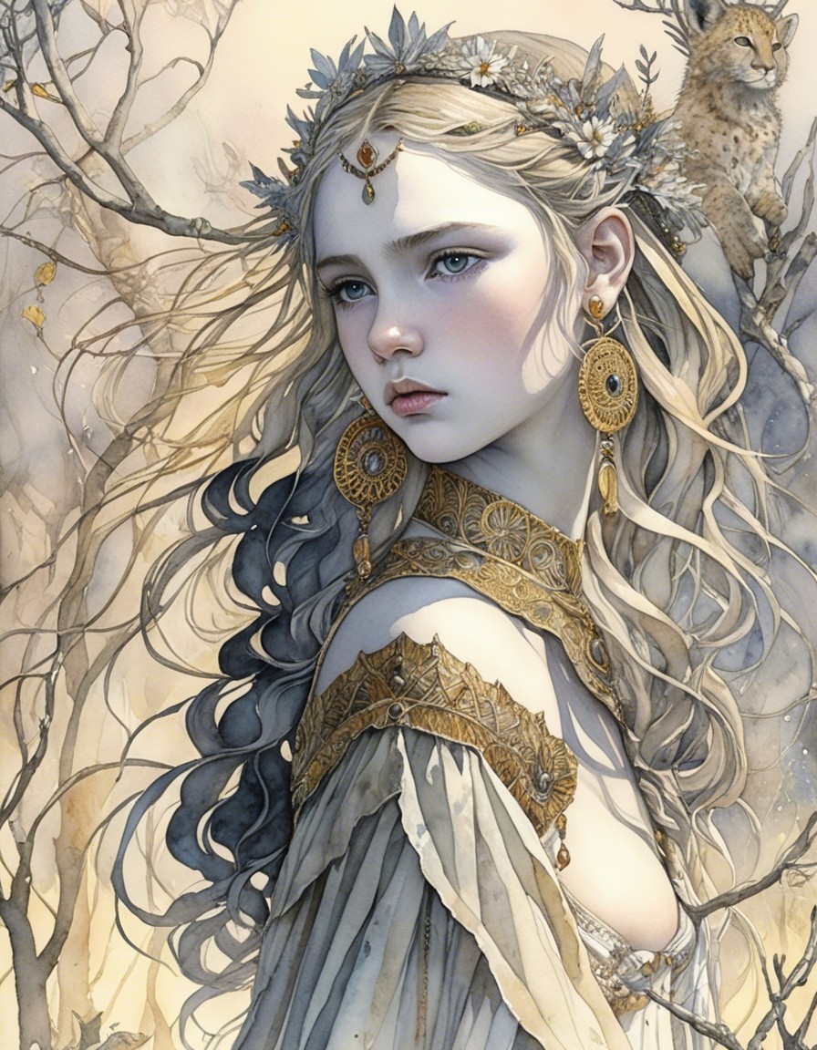 A young girl with flowing blonde hair, adorned in a richly embroidered, golden-accented dress. She gazes thoughtfully into the distance, surrounded by a soft, ethereal landscape.