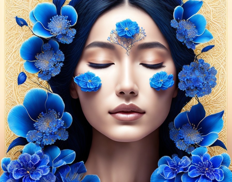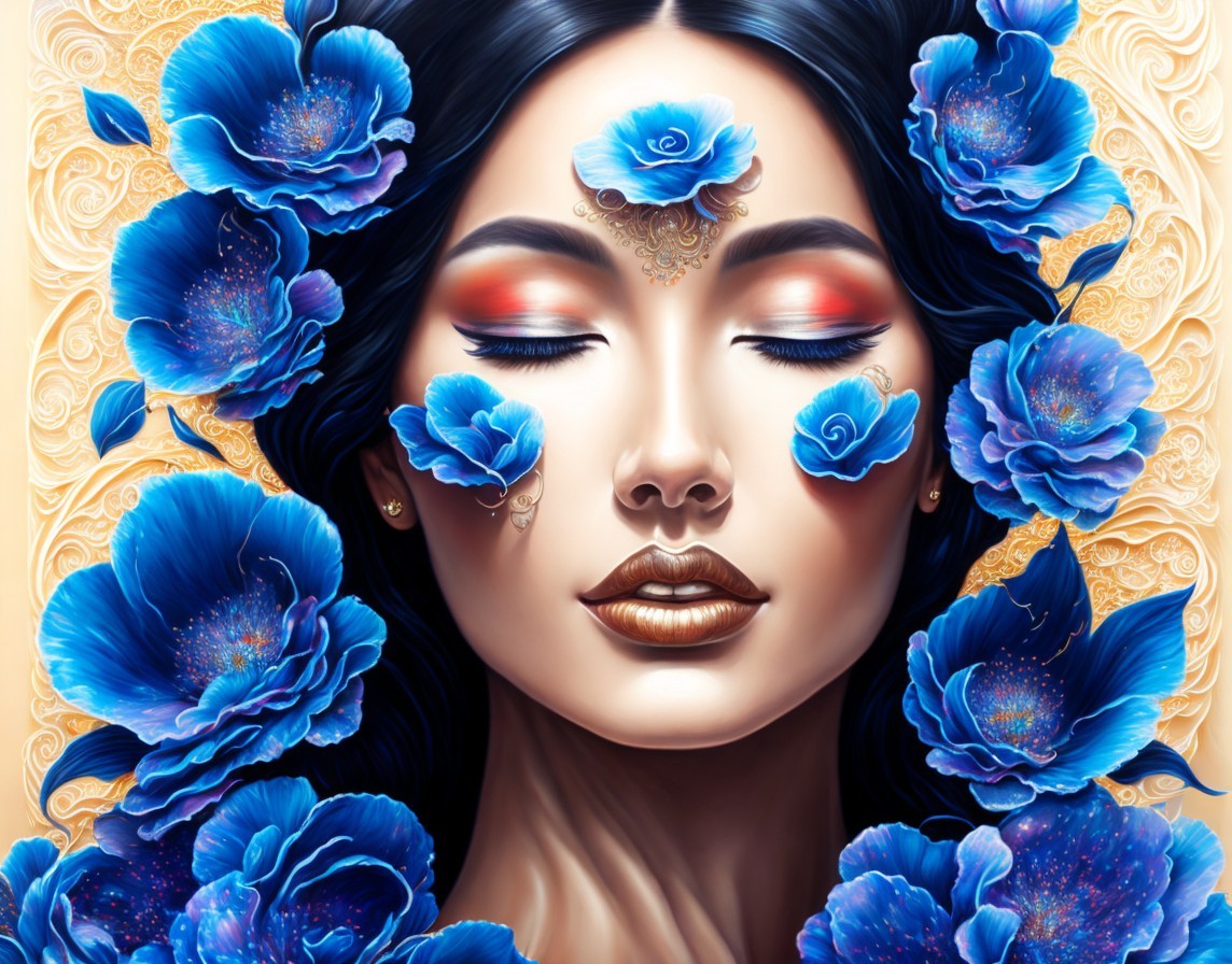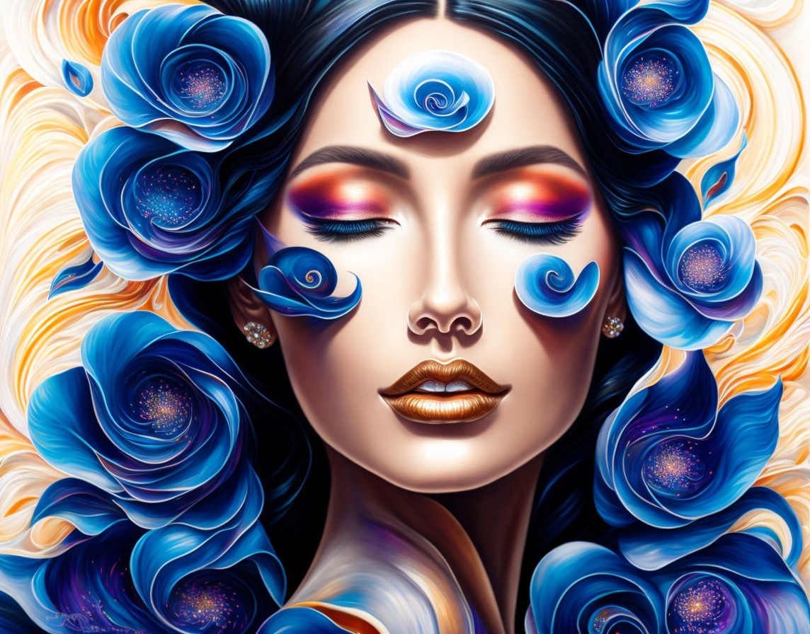 A vibrant digital painting of a woman with whimsical, swirling hair in shades of purple, blue, and white, with detailed, colorful makeup.