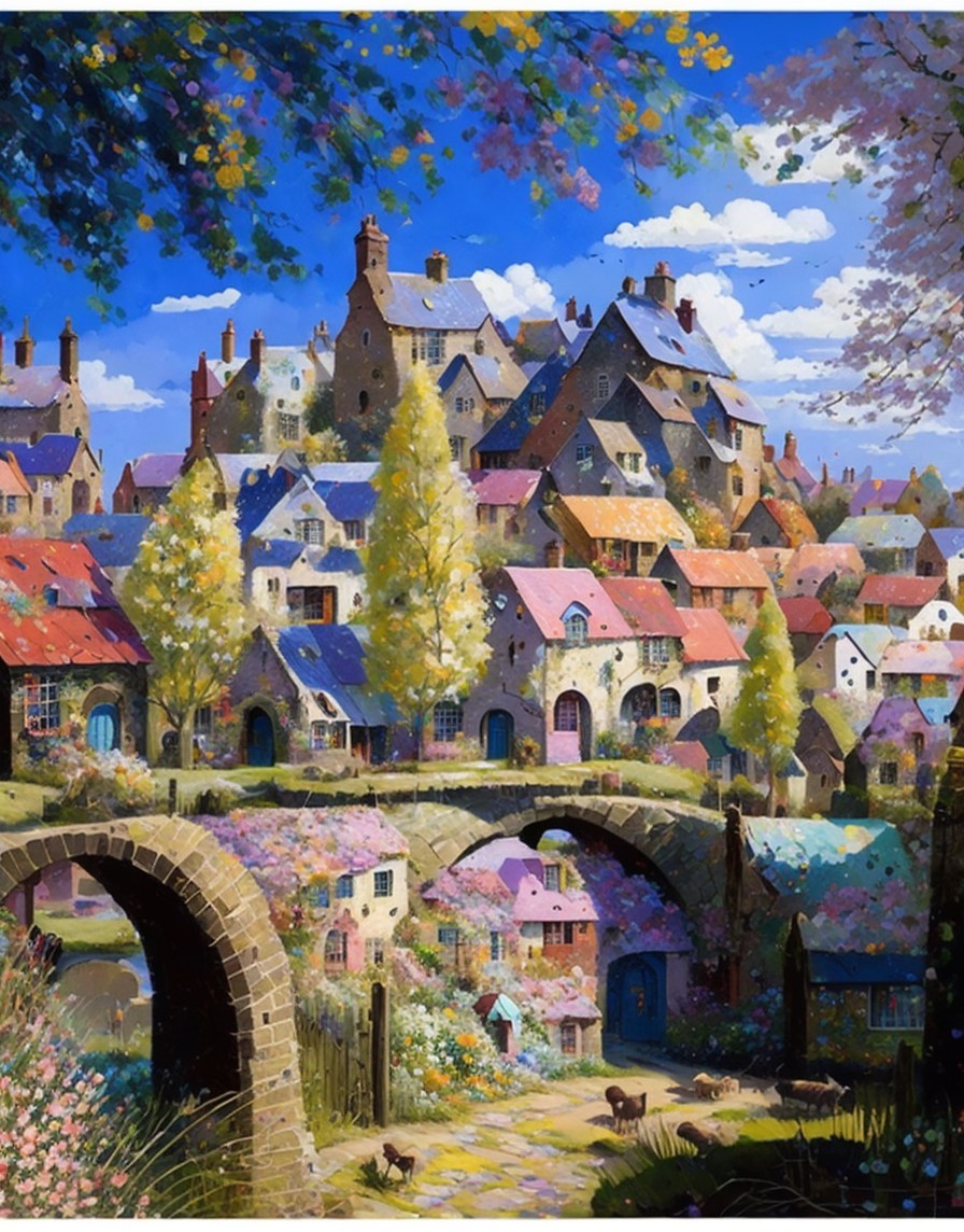 Colorful village painting: houses, bridge, trees, flowers under blue sky