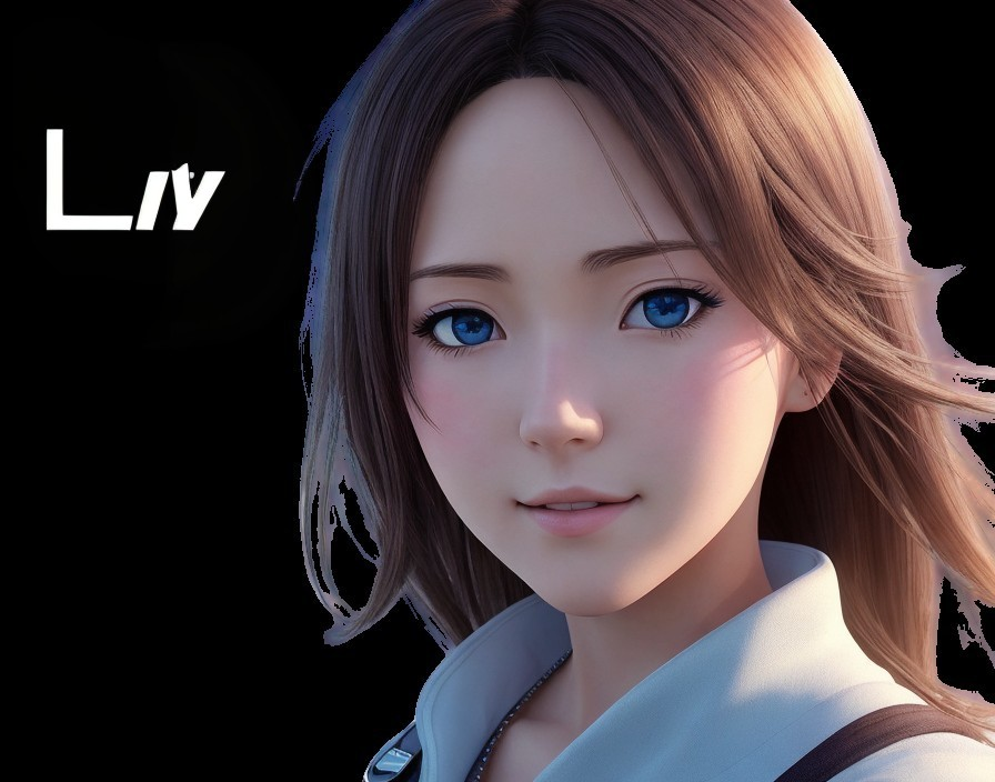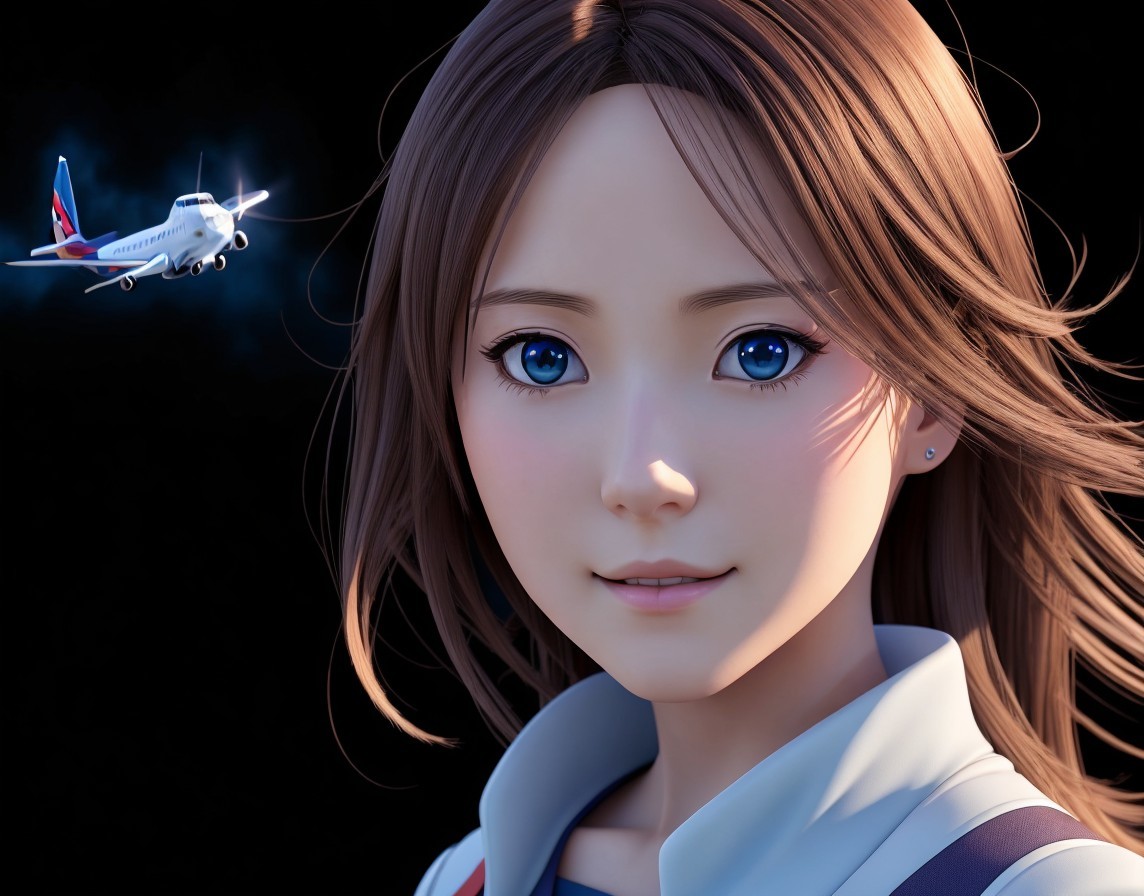Digital artwork of a young woman with brown hair, striking blue eyes, wearing a white outfit, and a gentle expression against a dark background.