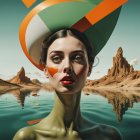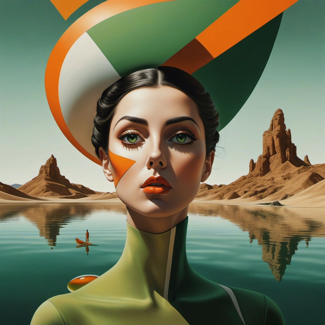 A surreal portrait of a woman with green eyes and dark hair, wearing a green, form-fitting garment. She has orange lipstick and an orange, white, and green geometric pattern painted on her face and head. Her head is framed by a large, abstract, C-shaped form in orange,