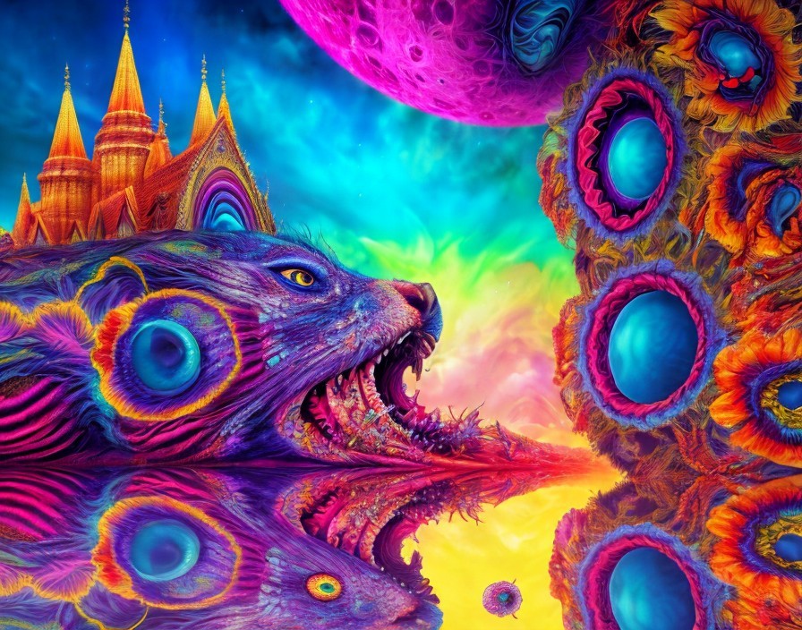 Surreal dragon art: eye-covered scales, purple moon, castle.