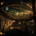 A stunning steampunk airship, featuring intricate stained glass windows depicting a night landscape. It hovers above a mystical city, illuminated by moons and stars, creating an enchanting atmosphere.