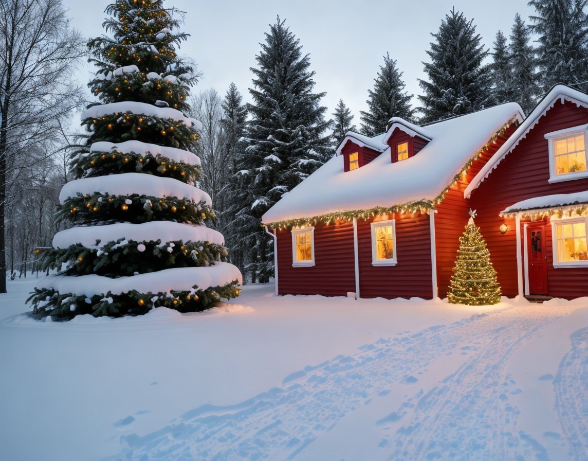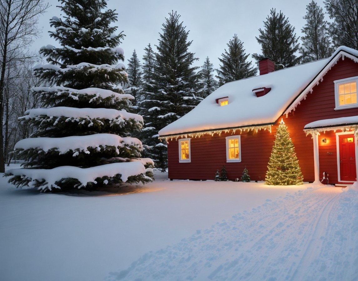 Prompt: I am standing in front of a large, red, Swedish house with white bars in winter with lots of snow. It is Christmas' Eve and the house is slightly decorated for Christmas. In front of the house are two tall fir trees with Christmas decoration. Inside I can see the fire place bursting with warmth.