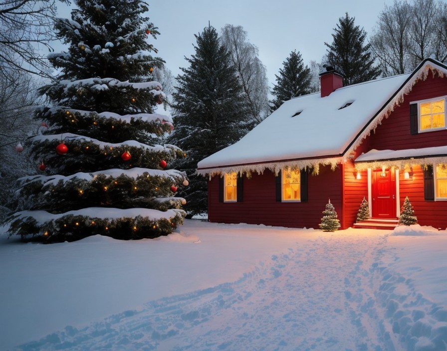 Prompt: "I am standing in front of a large, red, Swedish house with white bars in winter with lots of snow. It is Christmas' Eve and the house is slightly decorated for Christmas. In front of the house are two tall fir trees with Christmas decoration. Inside I can see the fire place bursting with warmth."