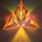 A glowing crystal pyramid radiates vibrant colors from its base, illuminated by intricate engravings. The interplay of light creates an enchanting, mystical atmosphere.