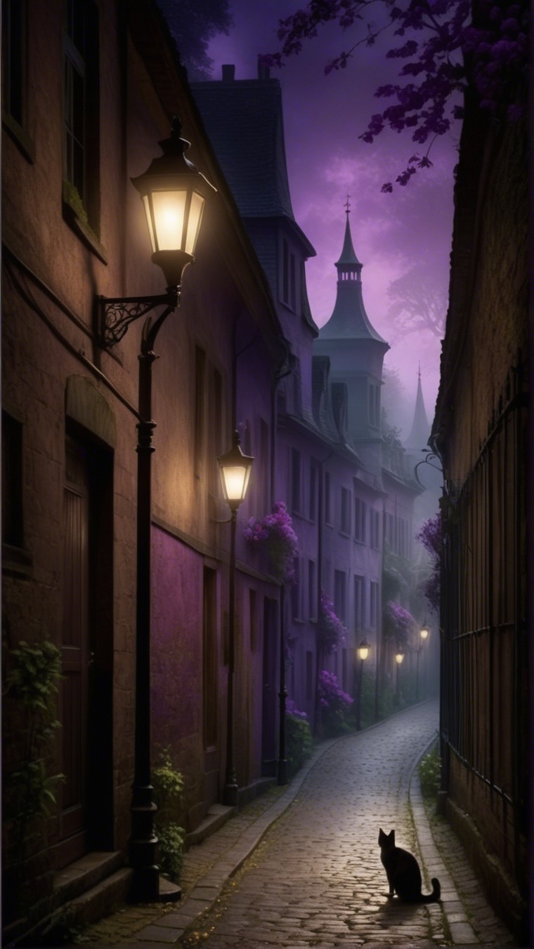 A serene, moonlit alleyway is illuminated by vintage street lamps. Lush purple blooms line the cobblestone path, while a solitary cat sits silently, adding a touch of mystery to the scene.