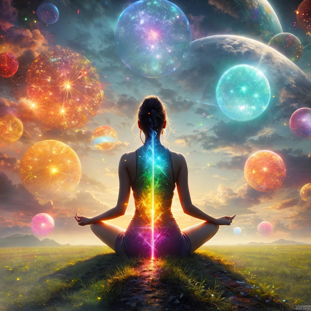 A person meditates outdoors, colorful energy chakras aligned along the spine, amidst a serene sunset with vibrant trees and skies.