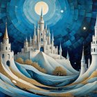 A vibrant, stylized landscape features whimsical buildings with domed roofs and spires amidst rolling hills. Bright flowers bloom in the foreground under a glowing full moon in a deep blue sky.