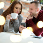 A couple in cozy sweaters shares a warm moment in a café, smiling at a phone while holding a cup of coffee. Soft lights and a rustic ambiance create a charming atmosphere.