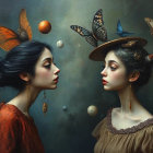 Two ethereal women gaze at each other, one adorned with butterflies and celestial spheres. The dreamy background enhances a sense of mystique and connection between them.