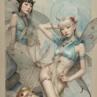 A serene figure with long, light blue hair sits gracefully, dressed in a flowing, pale kimono. Delicate autumn leaves frame her, enhancing the ethereal and contemplative atmosphere of the artwork.