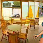 A vibrant restaurant scene features a woman in a teal dress walking through colorful tables and chairs. Bright walls and large windows reveal a sunny landscape outside.