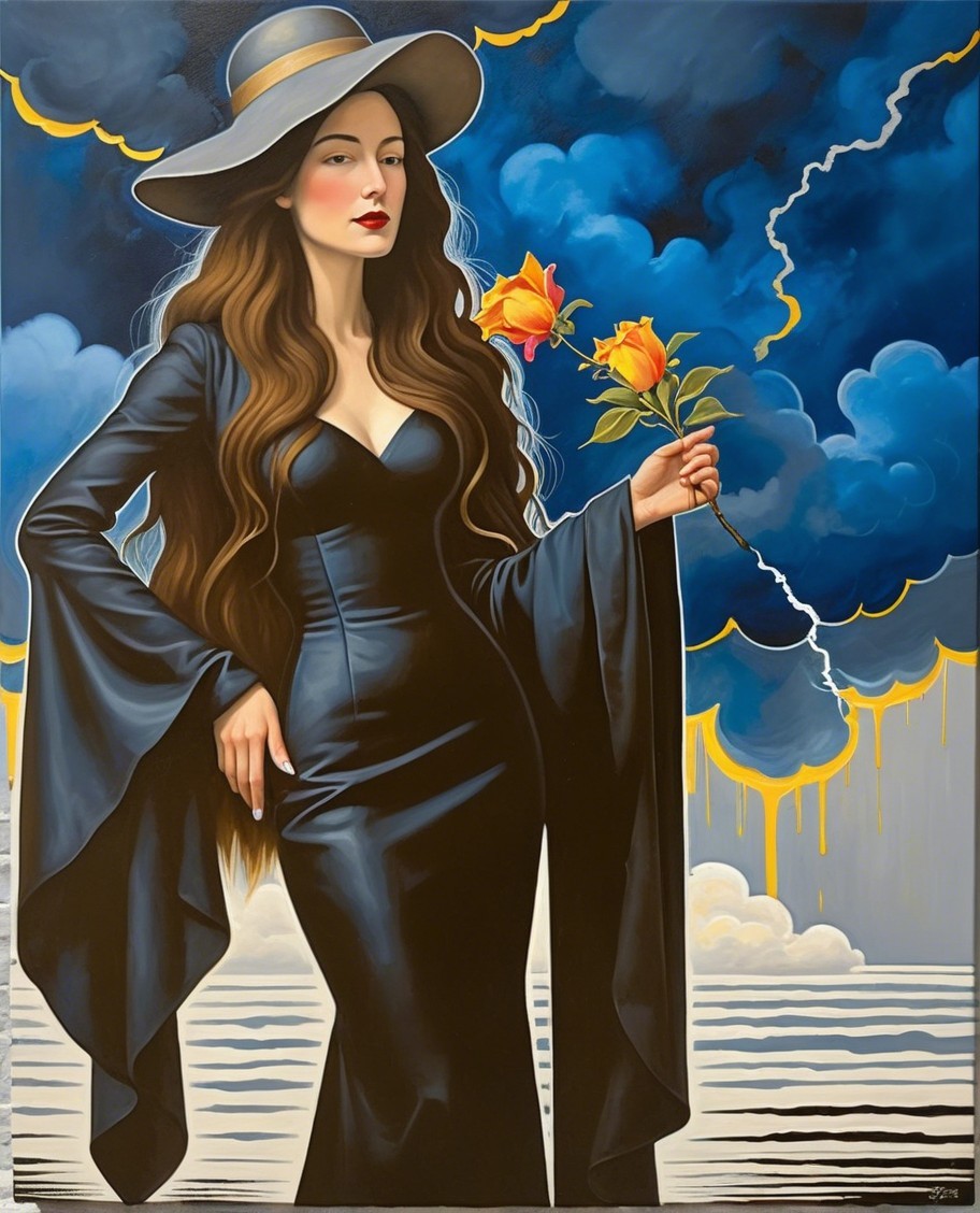 Prompt: Drippy Splashy acrylic texture, sharp, softened color scheme, splashy renaissance style painting with bluish clouds in stormy weather, splash ink technique, soft rounded edges, aquatint merged with aquarelle extrusion, stippled long-haired priestess with rose, yellow lightning strikes, detailed with whimsical clouds, overall color palette features warm blueish pastel tones, greys and creams. Liminal devourment. Occult, crepuscular, hints of darkness, captivating blend, fairytale-inspired elegance in the scene, dusk, 3d render, acrylic portrait, side view, hues by Overton Loyd, tints of Georgia O'Keeffe, gothic details, blotting, ercolor pen and ink by Steve Hanks filigree breathtaking Stylized gouache painting by noma bliss, stylized upper body portrait, dreamy enchantress with curly hair and black satin dress with metallic accessories, juvenile, cel-shaded, dethereal, groovy, night time, hues and shades of lavender and pale green, pastel tones of blue and sea-green, dark sky, natural background in acrylic ink, intricate soft pastel color palette, lakeshore setting, only curves, hatching, tessellated, tiny brush strokes, chromatic induction, vector 9:5, dynamic lighting casting raytraced shadows, dark atmosphere, reminiscent of Overton Loyd, unique aesthetic, otherworldly, back-lit, pop art painting reference, stylization with stacked-up perspective by nicoletta Ceccioli and Gian Lorenzo Bernini, watercolor and ink, colorful portrait in front of riverside, created in patchwork style by Aubrey Bear, reminiscent of abstract art: smooth, impasto tempera, pond weeds, purple, reflections in pen and ink, warm tones, three-point lighting, wavery, bold strokes, plasticity 1.4, detailed, dramatic lighting, pen and ink style of Overton Loyd, serene, warm color palette, precise Gelsculpt, luminism, intricate details, calm blotting paint with thick strokes, softened rounded edges, high detail, brushed textures in simplistic style of Jose Royo,