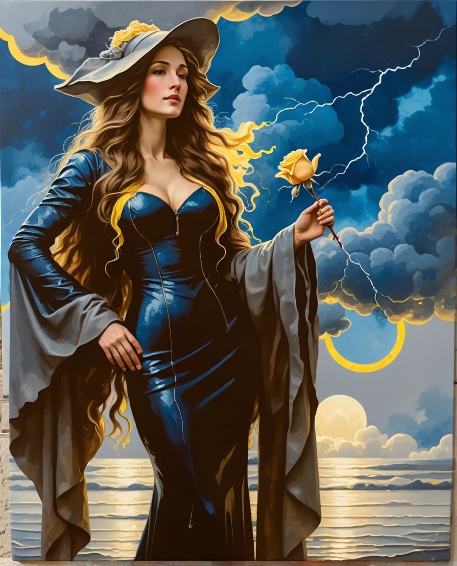 A stunning woman in a flowing blue gown stands by the water, holding a yellow rose. She exudes confidence, framed by dramatic clouds and a glowing moonlit sky, with lightning illuminating the scene.
