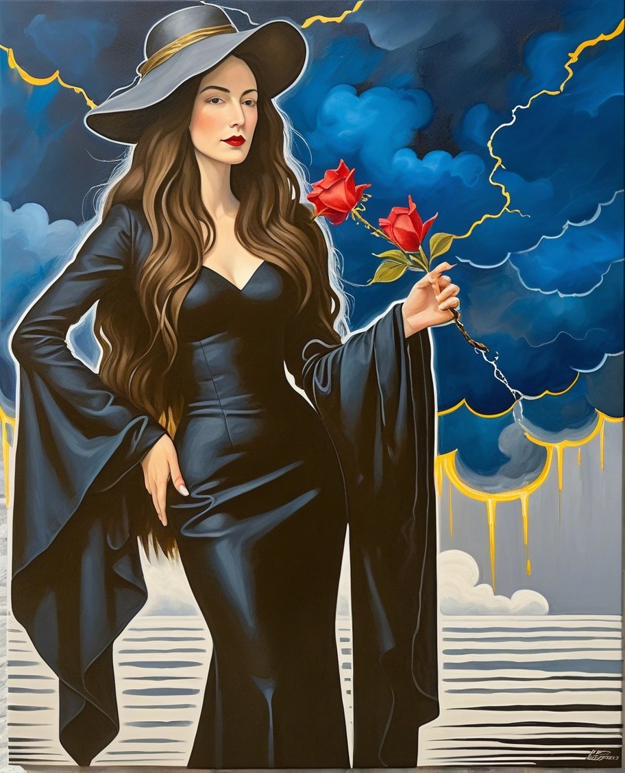 + Prompt:Acrylic ink on dark canvas, abstract portraiture, reminiscent of dark fantasy art merged with pulp art, traumacore 1.2, githuc rock lady with large flowing satin dress holds a rose, dark teal background with electric yellow flashes, hues, plasticity 1.6, luminosity 1.3, pale skin, perfect handsface, black stetson hat, juvenile beauty, enlightened ambiance, surreal patchwork, impasto tempera details, stacked-up perspective, soft rounded edges, only curves, LiDAR point cloud, Novelty architecture, octane render illustration 1.5, subtle coloring, romantic abstraction, Dark gothic look, weathered, dyed, tiny stacked lines, glossy, quilling, delicate coloring 1.3, triadic color scheme blue yellow black, vibrant colors, tessellated, stippled, long black stylized hairbangs, soft revealing attire, estranged metallic colors, metallic sparkling, raytraced shadows 1.8, divisionism, steampunk details, shadow mapping 1.3, layered, geometrical, multi-layered eyes, 1970s advertisements style, retro-futuristic, overall composition by Didier Lourenço and Overton Loyd, tints of Georgia O'Keeffe,