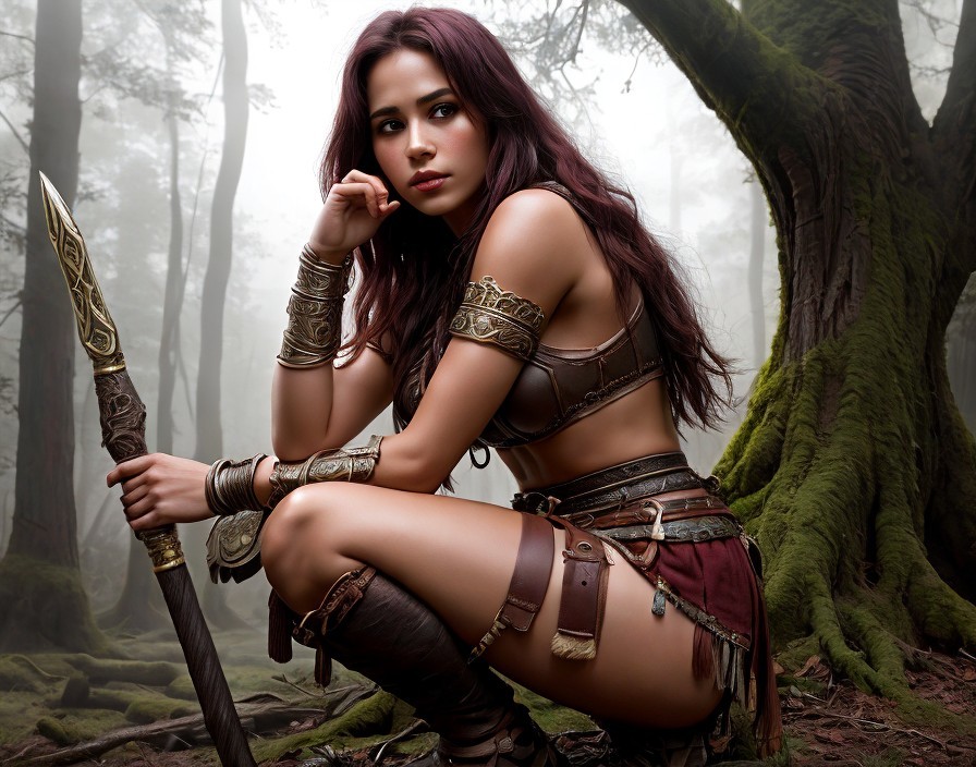Prompt: (beautiful erotic) barbarian girl dressed in an ancient warrior outfit crouches by a tree in an old dark scary forest. (correct anatomy of hands and legs)