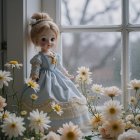 A delicate doll with blonde curls and a pastel blue dress stands on an open illustrated book surrounded by floral artwork, evoking a dreamy, whimsical atmosphere.
