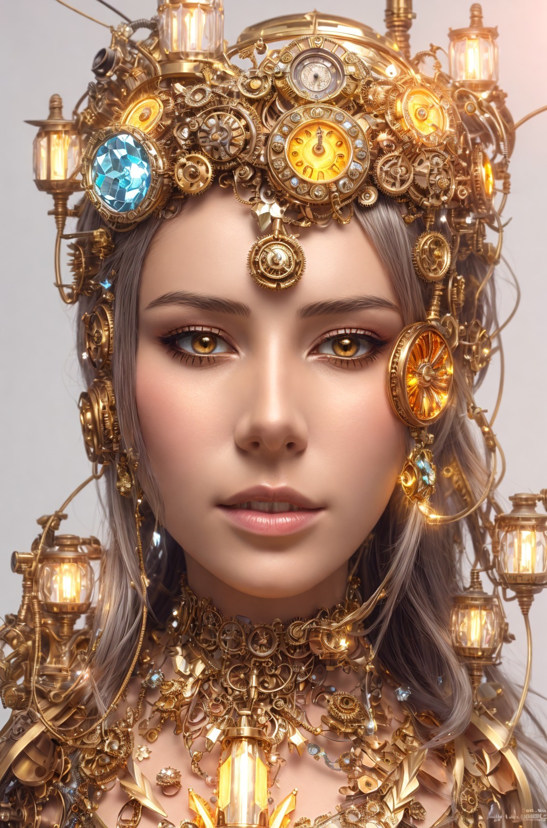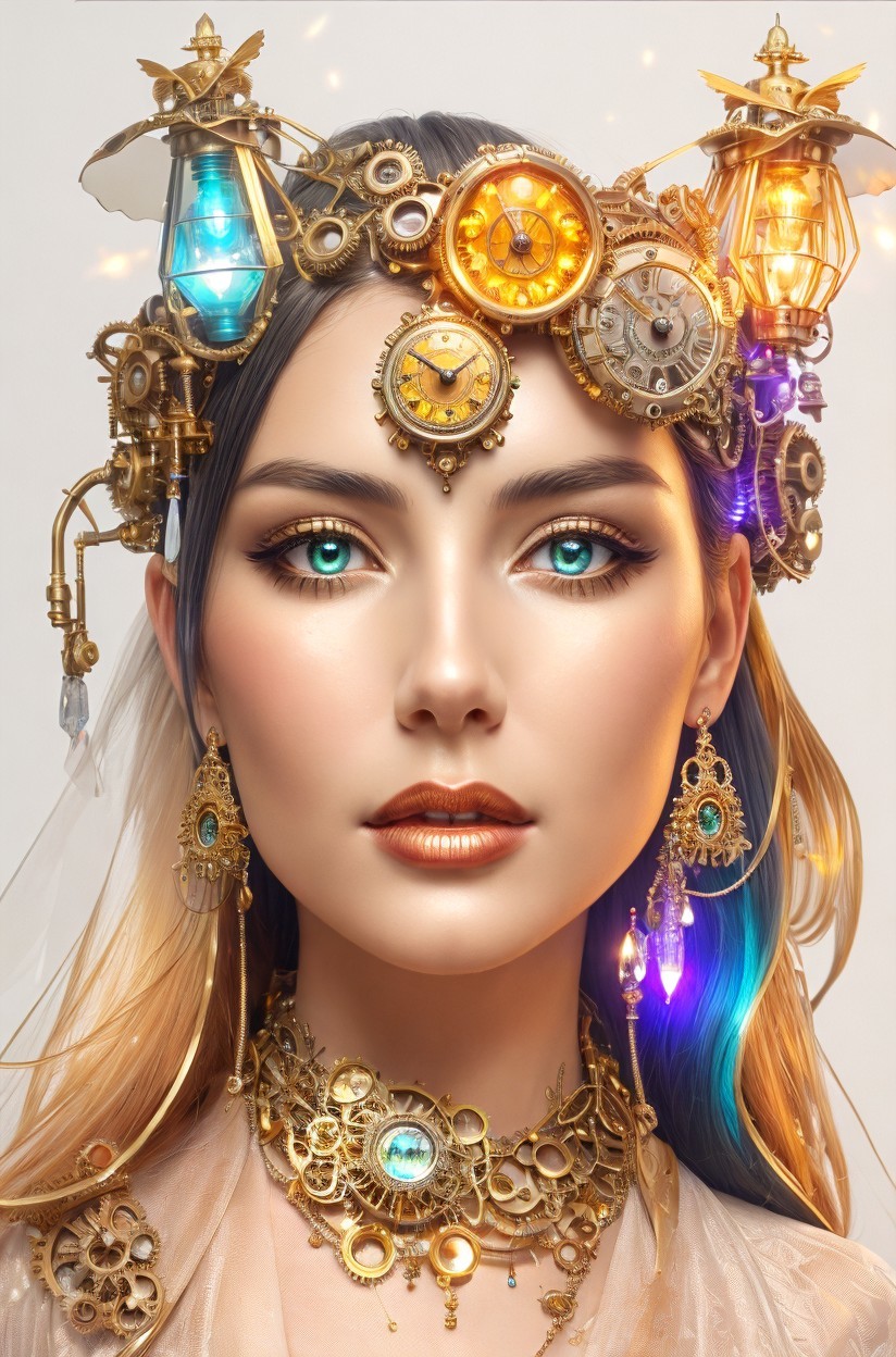 Fantasyi llustration, clockpunk, metallic fittings, female face , crystal hair, coronet, complexion ornamental details, mechanical fittings, bioluminescent glowing surrounding, volumetric lighting, (extremely detailed, intricate triadic color scheme orange ochre (white, fittings, indicators, clocks, tubes, wire, gears, gilded boilers, brass details, )7:5), plushy psychpomp, ornamental details, plushy psychpomp, yellow pastel, triadic color scheme yellow gold beige, saturated colors, 3d, hq, bright lights, art noveau, delicate, soft,dethereal, coffinwood 1.9, beautiful, very detailed, smooth plasticity, scattered background, Hyperrealism, inkpunk 1.8, spiritual essence, echaustic strokes, victorian garments, gothic horror details, vibrant colors, fauvistic cotton cuts,ambient occlusion 1.5, anisotropic filtering 1.7, 3d effects 1.8, shadow mapping 1.3, dynamic lighting 1.7, high coloring 1.9, octane render illustration 1.5,