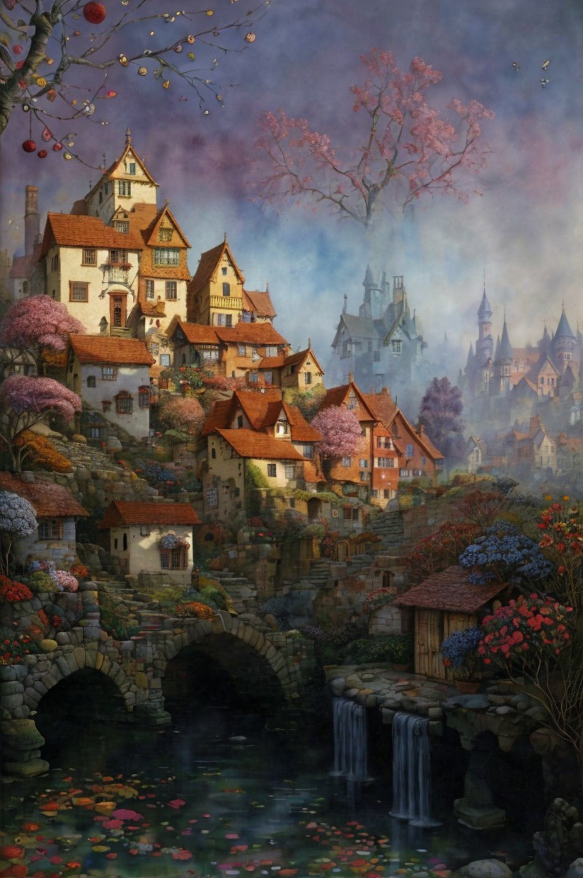 + Prompt:Vibrant Houses made of rocks, bricks and red marbles with stone path alley, trees, flowers, moss Gorgeous amazing watercolor patchwork, elegant patchwork painting by Daniel Merriam, Arthur Rackham Kandinsky dot line drawing, highly detailed, exquisitely intricate, beautiful, clear, high quality, colorful, , fantastic - Iwona Lifsches, Alex Alemany (colourful window curtains)