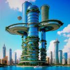 A futuristic cityscape with a cluster of modern buildings featuring glass facades and lush green vegetation on their rooftops and balconies, interconnected by sky bridges, all situated on an artificial island in a calm body of water. The island has a semi-circular, glass-domed structure at its base, reflecting the blue