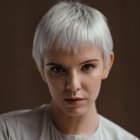 A stunning portrait of a woman with long, wavy blonde hair, flawless skin, and captivating eyes. She wears elegant earrings and a chic white blazer, exuding confidence and grace.