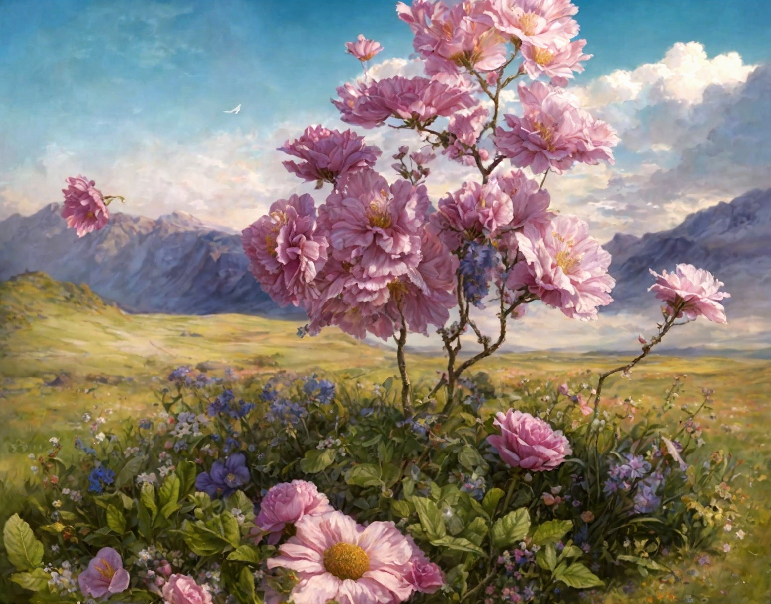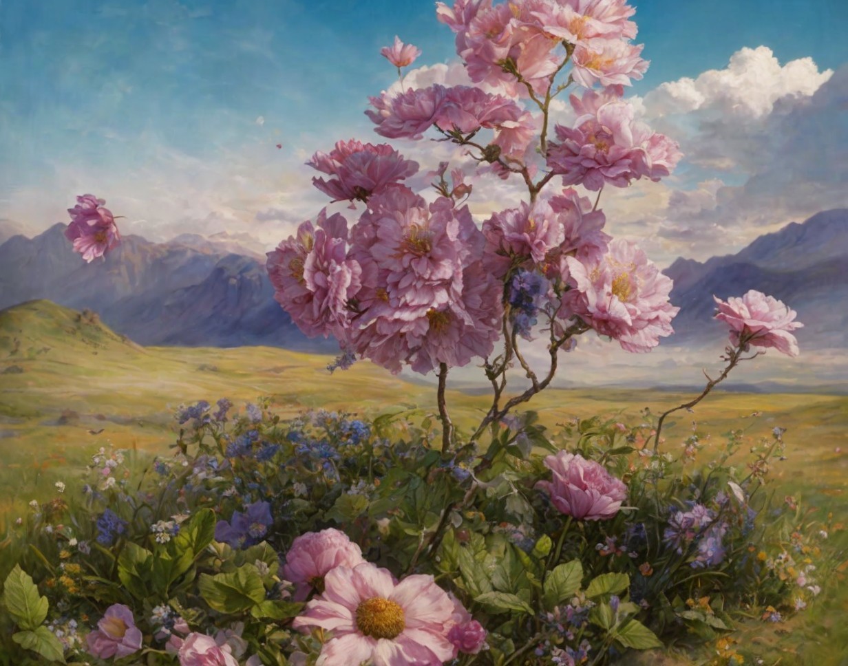 A vibrant painting of pink blossoms with a backdrop of majestic mountains and a clear blue sky.