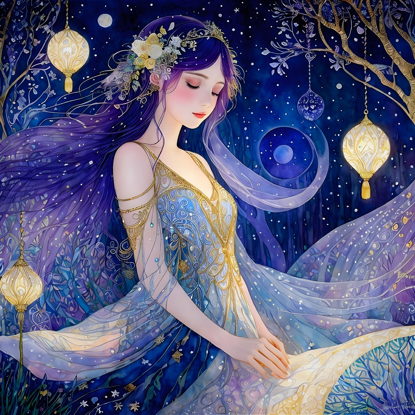 A captivating winter garden scene unfolds under falling snowflakes and shining stars, blending fantasy and vintage aesthetics with dynamic lighting and intricate botanical illustrations.